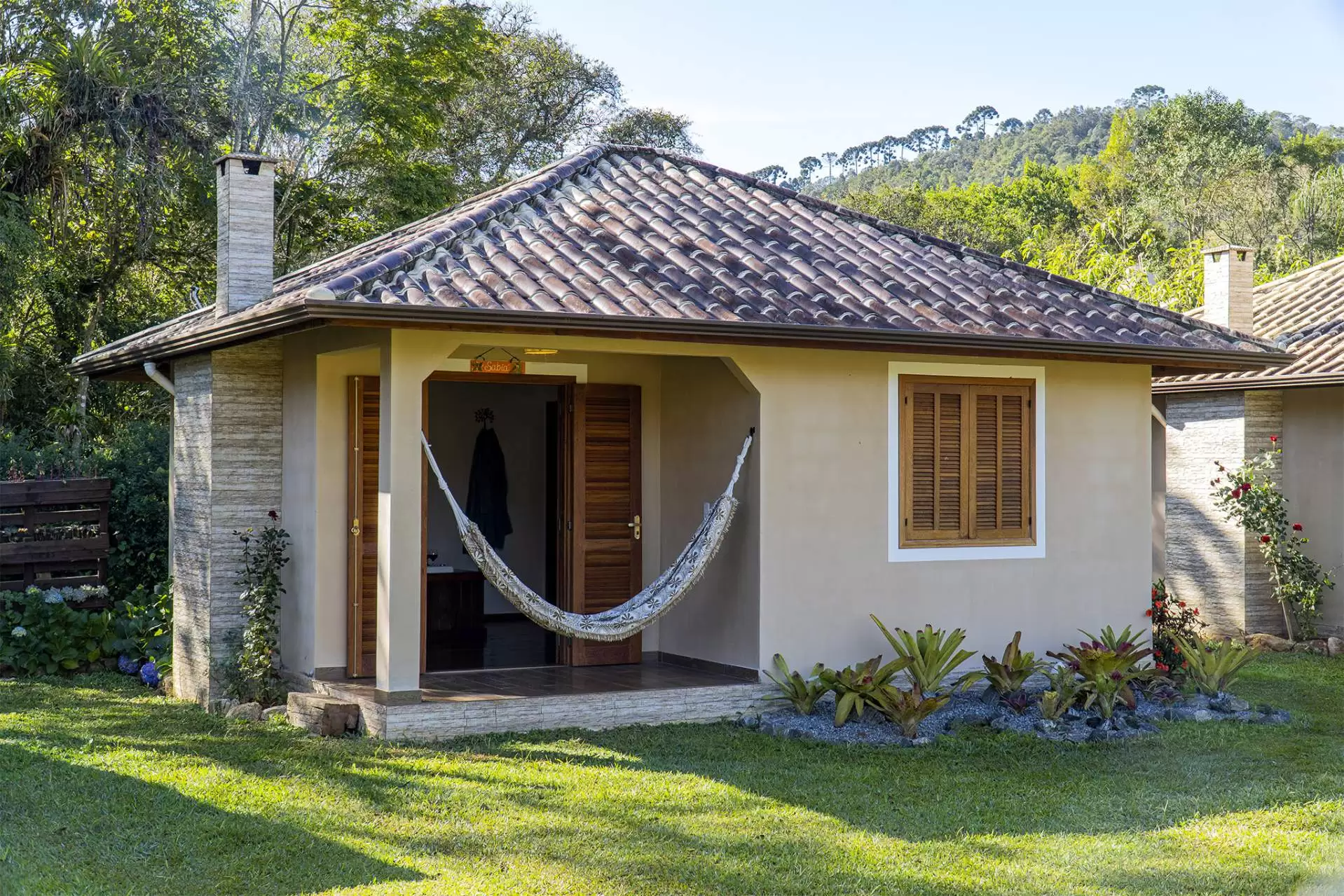 Chalé de 32m2 exclusivo para casais, é equipado com cama king size, hidromassagem dupla, lareira, frigobar, TV de 32 com Oi TV, Wi-Fi, armário, banheiro box com aquecimento à gás, secador de cabelo, amenities (espuma e sais de banho, secador de cabelo, varanda com rede e vista, além de estacionamento privativo.