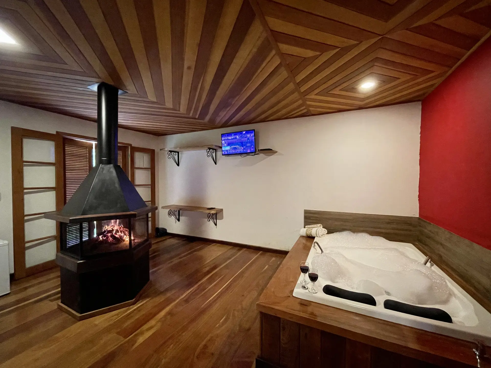 Equipada com cama queen, hidromassagem dupla com cromoterapia, lareira, frigobar, TV, amenities, roupas de cama e banho, banheiro box com aquecimento à gás e varanda com rede.