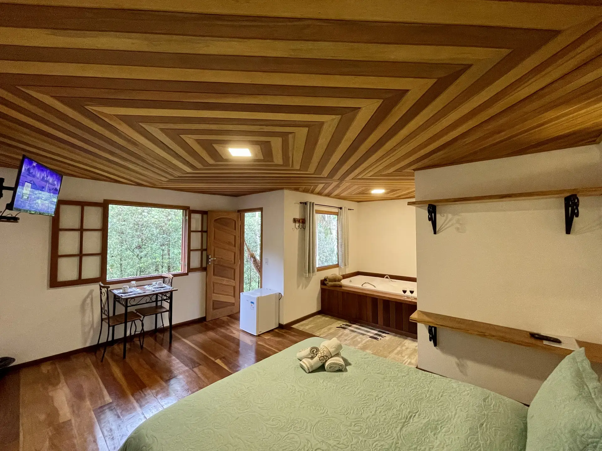 Equipada com cama queen, hidromassagem dupla com cromoterapia, frigobar, TV, amenities, roupas de cama e banho, banheiro box com aquecimento à gás e varanda com rede.